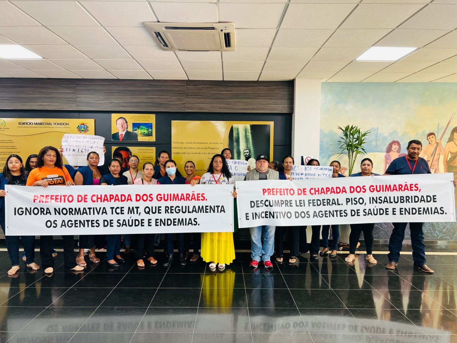 Cerca de 25 profissionais de saúde de Chapada dos Guimarães se manifestaram em Cuiabá no dia 11 de março de 2025, em frente ao Tribunal