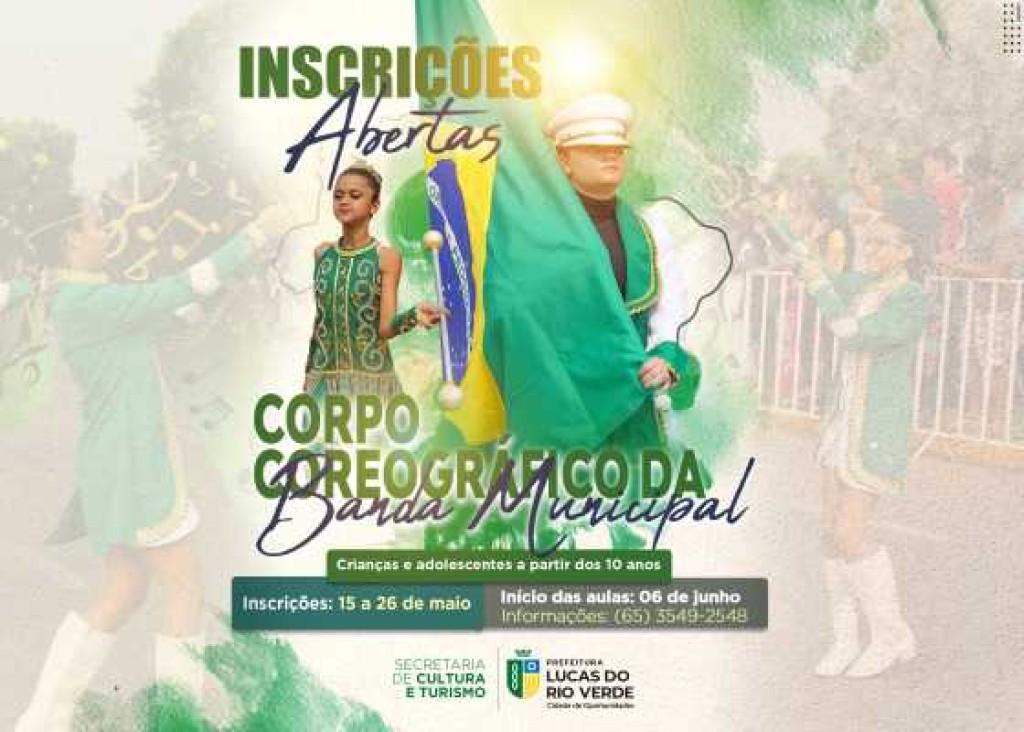 A Secretaria de Cultura e Turismo de Lucas do Rio Verde informa que as inscrições para o Corpo Coreográfico da Banda Municipal de Lucas do Rio Verde (Bamulv) encerram nesta sexta-feira (26). O objetivo é formar o grupo de dança para participar do Desfile de 7 de Setembro, entre outras apresentações da fanfarra na cidade.