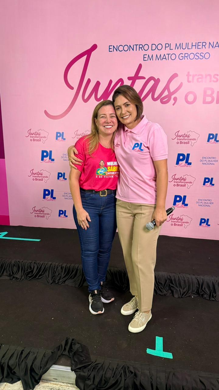 A ex-primeira-dama do Brasil e presidente do PL Mulher Nacional, Michelle Bolsonaro, esteve presente no município de Sorriso, em Mato Grosso, neste sábado (01.11). Durante o evento que reuniu lideranças do PL de todo o Estado., Michele abraçou a prefeita de Várzea Grande, Flávia Moretti (PL), e deixou palavras de apoio e prometeu ligar para conversar com a várzea-grandense.